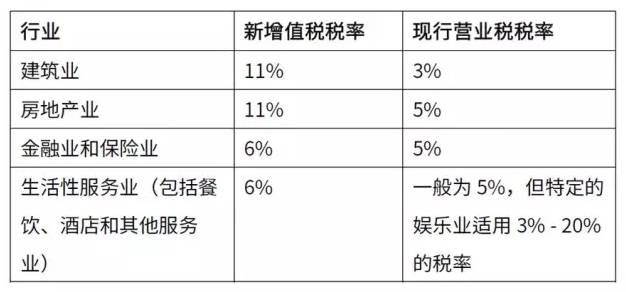 尽管李克强总理的政府工作报告中未明确说明营改增剩余行业将适用的增值税税率,然而预期的增值税税率之前已经充分讨论过。根据各种公开报道,我们在下表中列出了这些行业适用的增值税税率以及现行营业税税率。由于增值税实际上是基于差额(销项减进项)来计算的,而营业税是基于总额(仅销项)来计算的,所以单纯将新税率和老税率进行比较是没有意义的: